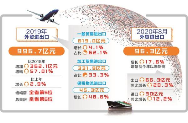 “十三五”期间,泰州市对外贸易持续量增质提,不断凸显竞争优势。2019年泰州市外贸进出口996.7亿元,比2015年增加362.1亿元,增幅57.01%;比上年增长2.9%,增幅居全省第5位,总量居全省第6位。