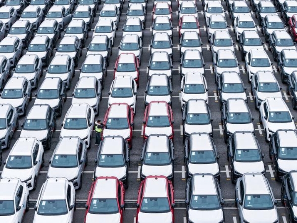 在江苏太仓港汽车码头堆场里拍摄的准备运输出海的商品车(无人机照片)。新华社记者 李博 摄