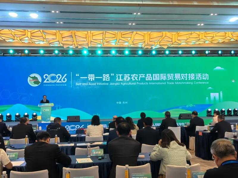 4月24日下午,由省农业农村厅、省贸促会和江苏南京国家农业高新技术产业示范区共同主办的2026“一带一路”江苏农产品国际贸易对接活动在苏州国际博览中心举行。省农业农村厅副厅长曹丽虹、苏州市人民政府副市长查颖冬、乌拉圭东岸共和国驻上海总领事馆总领事马塞罗•马龙出席活动并致辞,省贸促会副会长魏杰钢主持活动。来自秘鲁、马来西亚、荷兰、韩国等国驻上海总领事馆官员,境内外贸易投资促进机构及我省龙头农业企业、供销社、电商平台、代理商和进口商代表100余人参加活动。