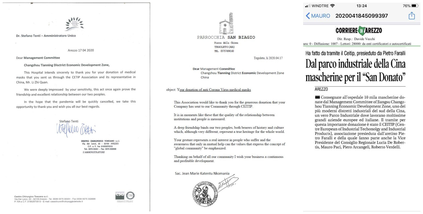 经过半个多月的长途跋涉和分派工作,2万只口罩抵达在欧洲的合作伙伴欧洲工业技术与工业用品中心处,并由其分发到了意大利抗疫一线的圣多纳托迪阿雷佐医院、托斯卡纳外科中心和特戈莱托教区,并举行分发仪式,欧洲工业品中心主席皮特罗·法拉利,矛伍罗·巴齐和托斯卡纳地区副总统露西娅·德罗伯蒂斯出席了分发仪式。拓卡斯纳外科中心和特戈莱托教区以函件形式表达对常州天宁经开区的感谢之情,当地媒体《阿雷佐邮报》也作出相关报道。