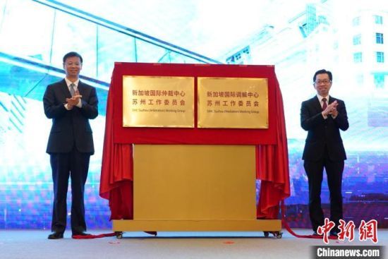 新加坡国际仲裁中心苏州工作委员会、新加坡国际调解中心苏州工作委员会揭牌。 周志杭 摄