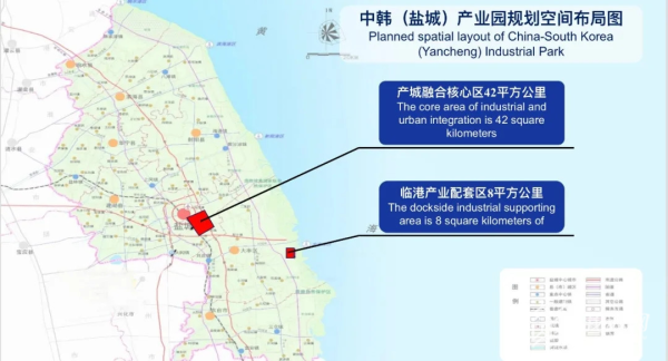 作为国家层面合作园区、长三角地区唯一的对韩合作国家级平台,中韩(盐城)产业园依托国家级盐城经济技术开发区建设,规划面积50平方公里,空间布局为产城融合核心区和临港产业配套区。