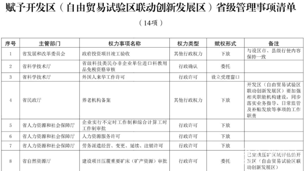 9月23日,记者从盐城市有关部门获悉,江苏省政府近日印发有关决定,赋予中国(江苏)自由贸易试验区第二批30项省级管理事项,赋予54个开发区(自由贸易试验区联动创新发展区)14项省级管理事项。这是江苏首次将省级权限赋予开发区。此次赋予联创区、自贸试验区的44项省级管理事项,涉及省发改委、省教育厅、省科技厅、省工信厅等19个省级部门,服务对象都是市场主体。