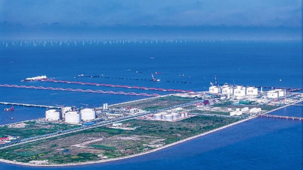 北翼的如东洋口港,LNG接卸船往来靠泊,全年外输量突破百亿立方米,是当前长三角地区最繁忙的天然气接卸储运枢纽,也为临港产业提供稳定可靠的物流运输保障,能源和化工产品进出口约占如东全县外贸总值七成。